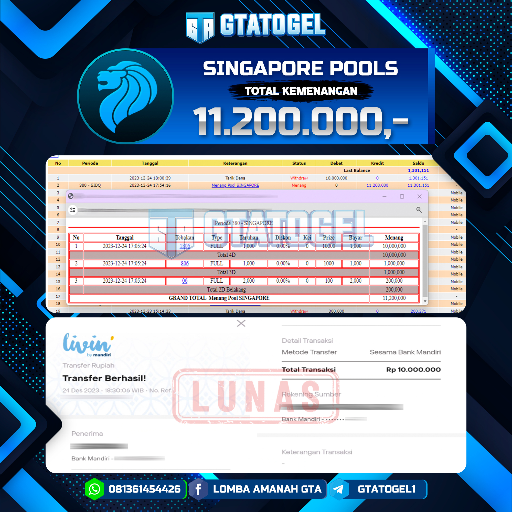 GTATOGEL – BUKTI WITHDRAW KEMENANGAN JP TOGEL SINGAPORE POOLS TODAY SEBESAR Rp. 11.200.000,- DI BAYAR LUNAS !!!