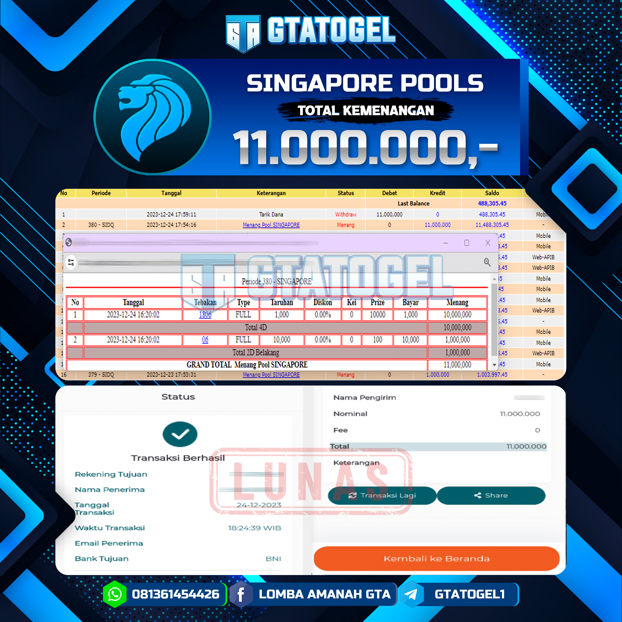 GTATOGEL – BUKTI WITHDRAW KEMENANGAN JP TOGEL SINGAPORE POOLS TODAY SEBESAR Rp. 11.000.000,- DI BAYAR LUNAS !!!