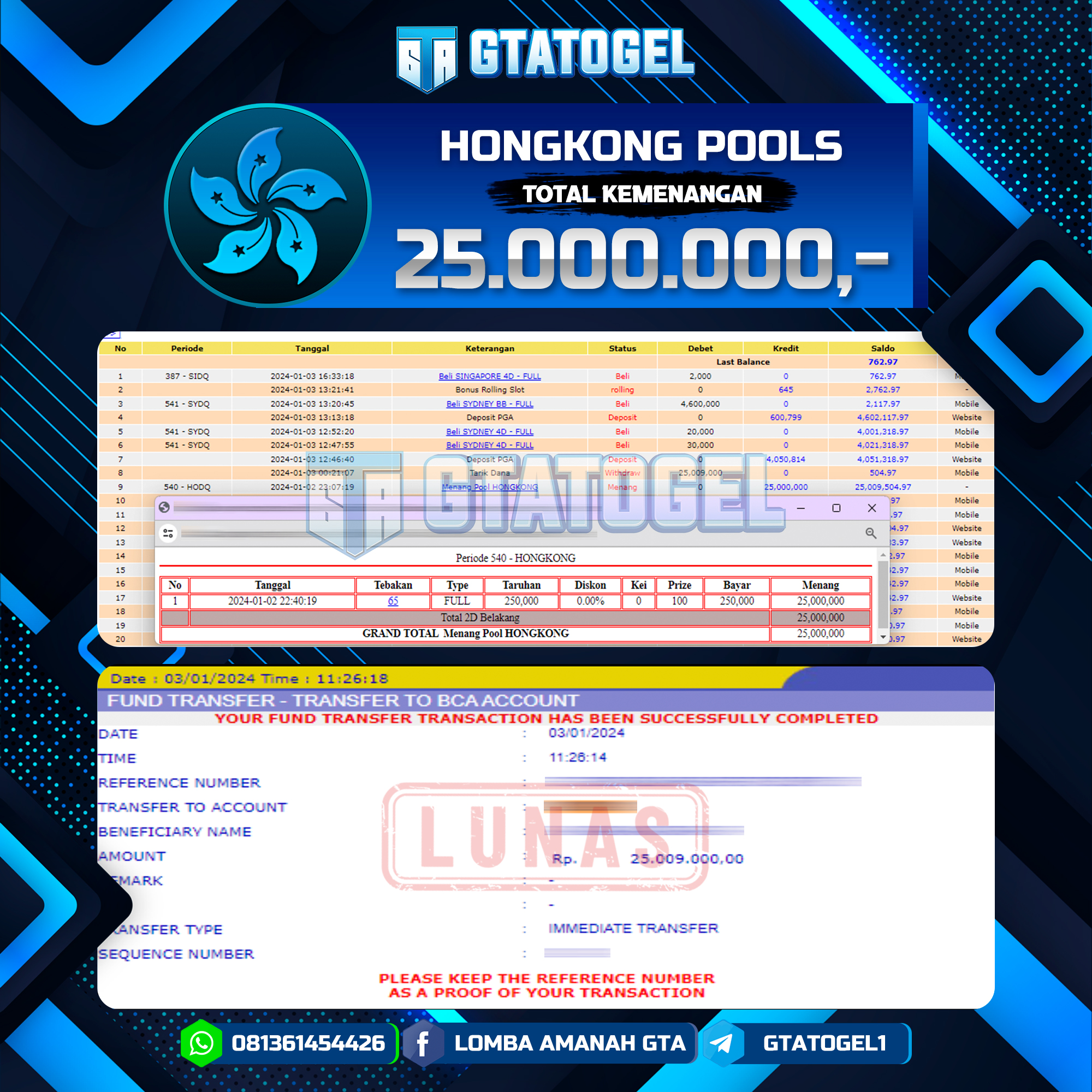GTATOGEL – BUKTI WITHDRAW KEMENANGAN JP TOGEL HONKONG POOLS SEBESAR Rp. 25.000.000,- DI BAYAR LUNAS !!!