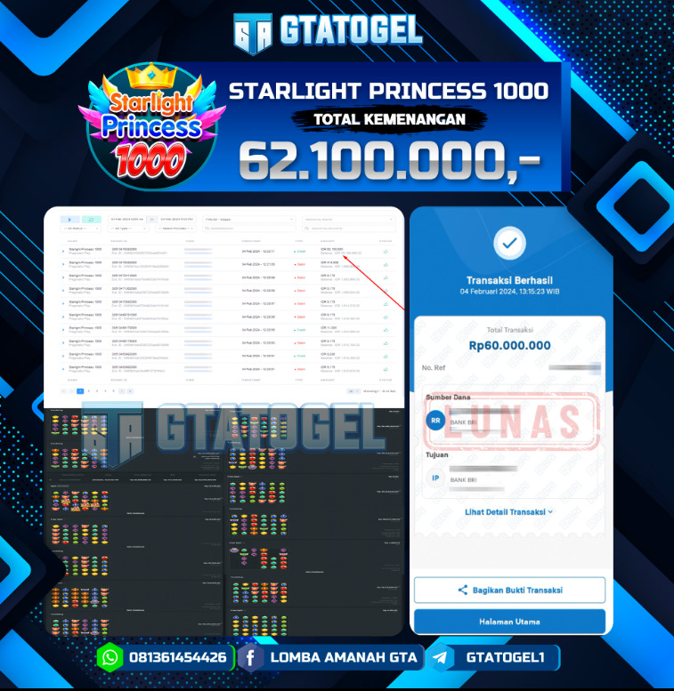 GTATOGEL – BUKTI WITHDRAW KEMENANGAN JP SLOT STARLIGHT PRINCESS 1000 SEBESAR Rp. 62.100.000,- DI BAYAR LUNAS !!!