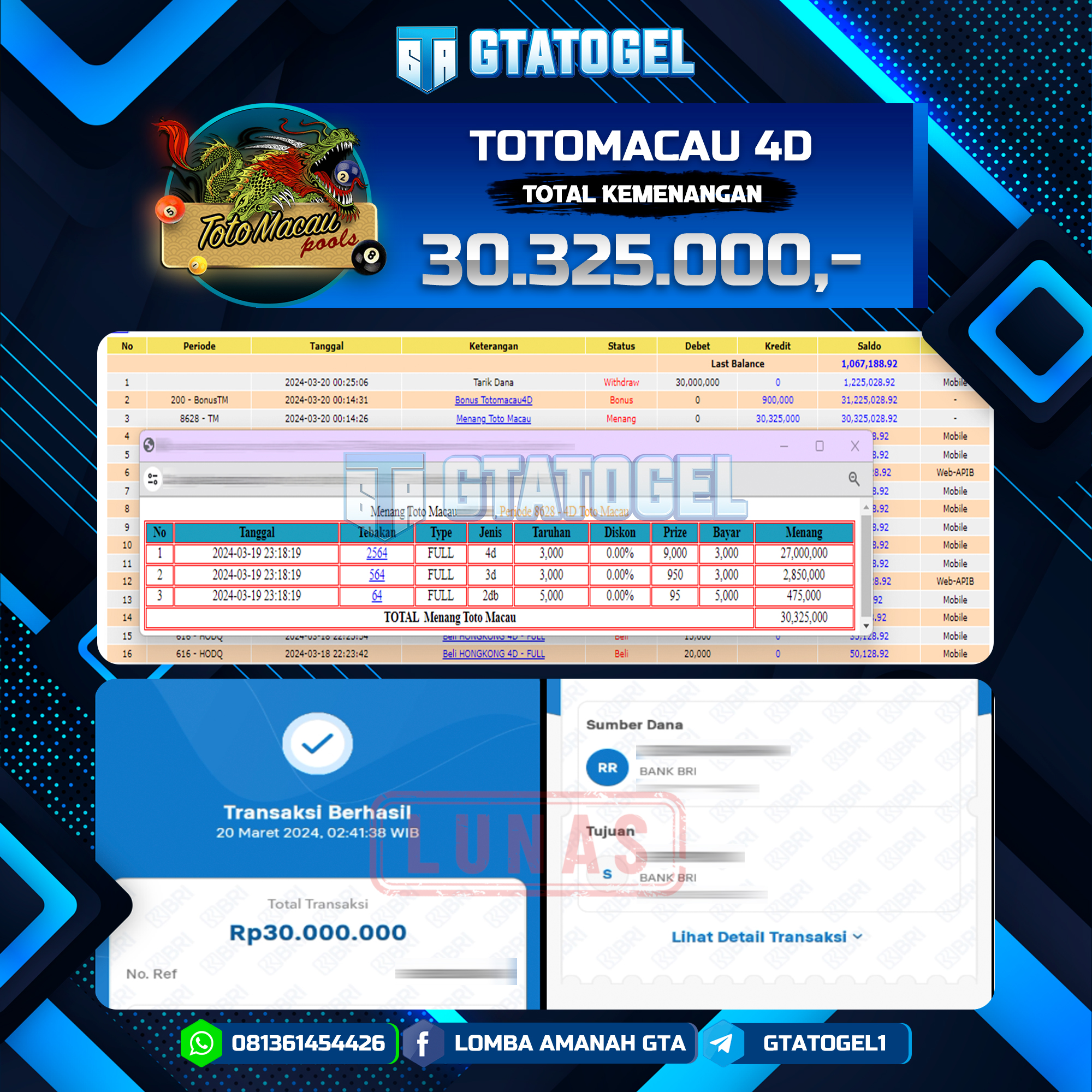 GTATOGEL – BUKTI WITHDRAW KEMENANGAN JP TOTOMACAU 4D Rp. 30.325.000,- DI BAYAR LUNAS !!!