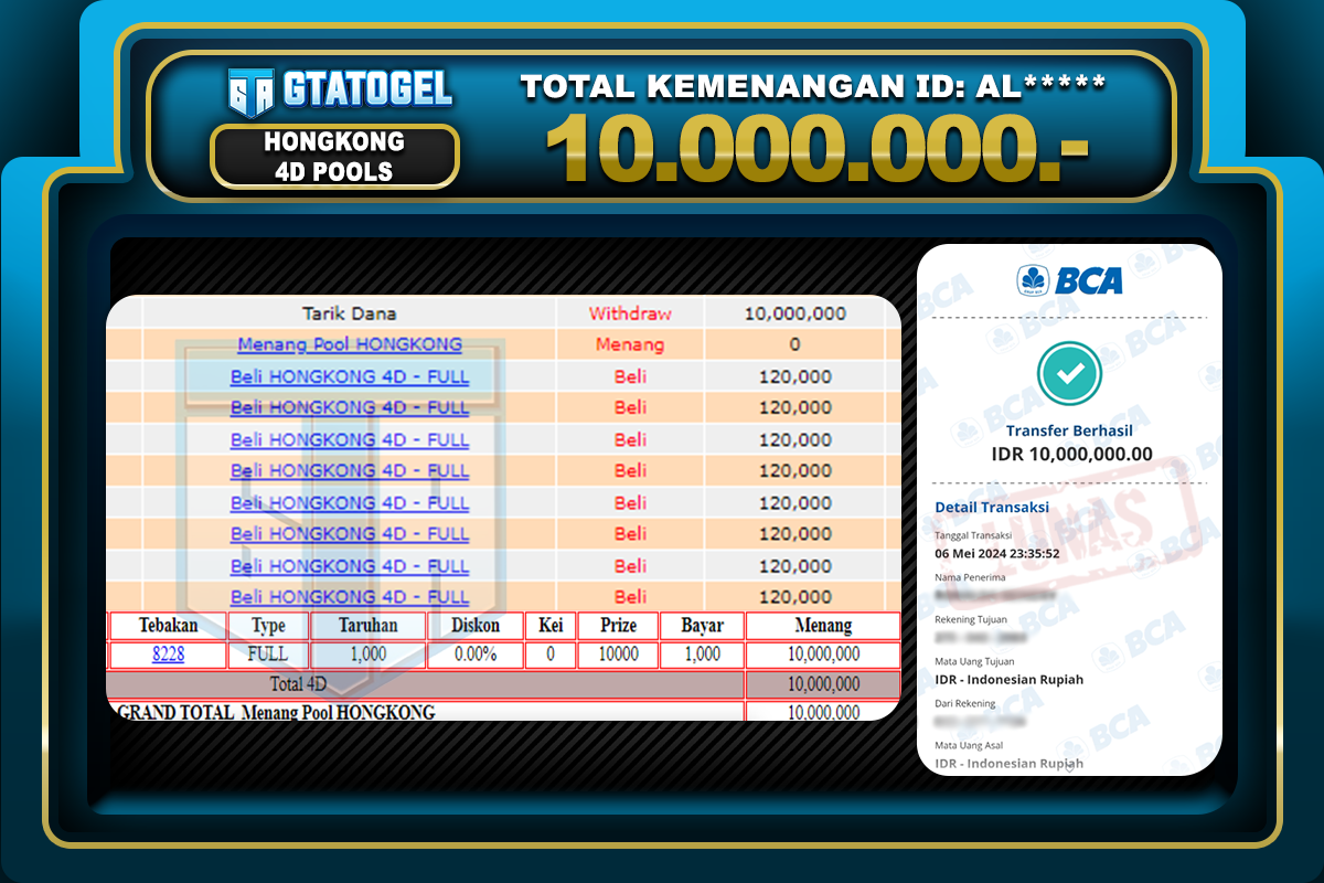 GTATOGEL – BUKTI WITHDRAW KEMENANGAN JP HONGKONG POOLS Rp. 10.000.000,- DI BAYAR LUNAS !!!