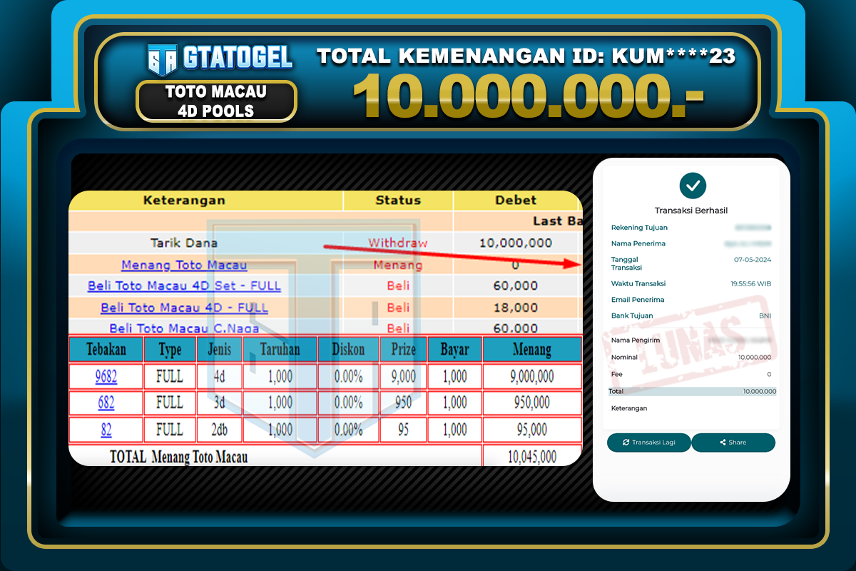 GTATOGEL – BUKTI WITHDRAW KEMENANGAN JP TOTOMACAU 4D POOLS Rp. 10.000.000,- DI BAYAR LUNAS !!!