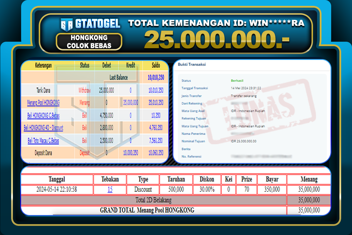 GTATOGEL – BUKTI WITHDRAW KEMENANGAN JP HONGKONG COLOK BEBAS Rp.25.000.000,- DI BAYAR LUNAS !!!