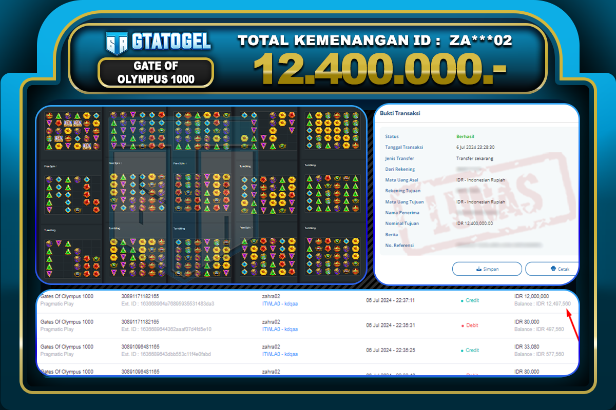 GTATOGEL – BUKTI WITHDRAW KEMENANGAN JP GATE OF OLYMPUS Rp. 12.400.000,- DI BAYAR LUNAS !!!