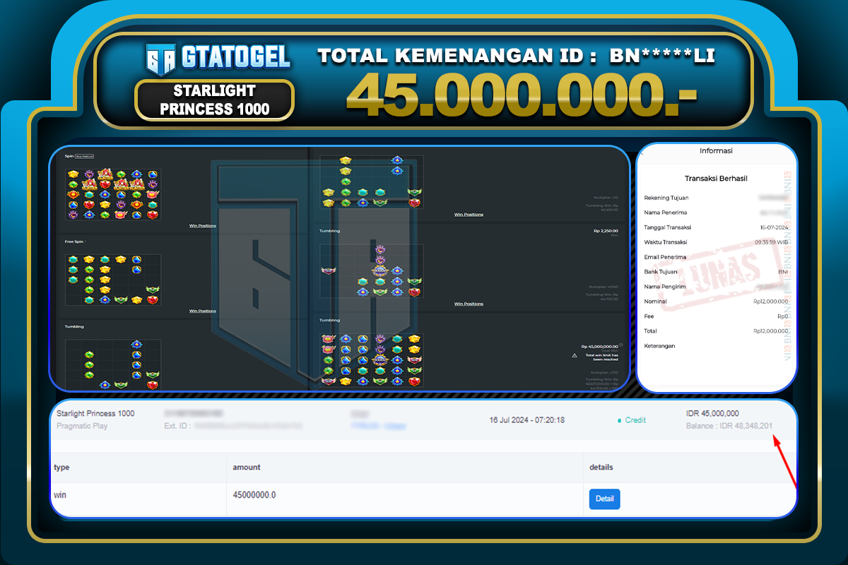 GTATOGEL – BUKTI WITHDRAW KEMENANGAN JP SLOT STARLIGHT PRINCESS 1000 SEBESAR Rp. 45.000.000,- DI BAYAR LUNAS !!!