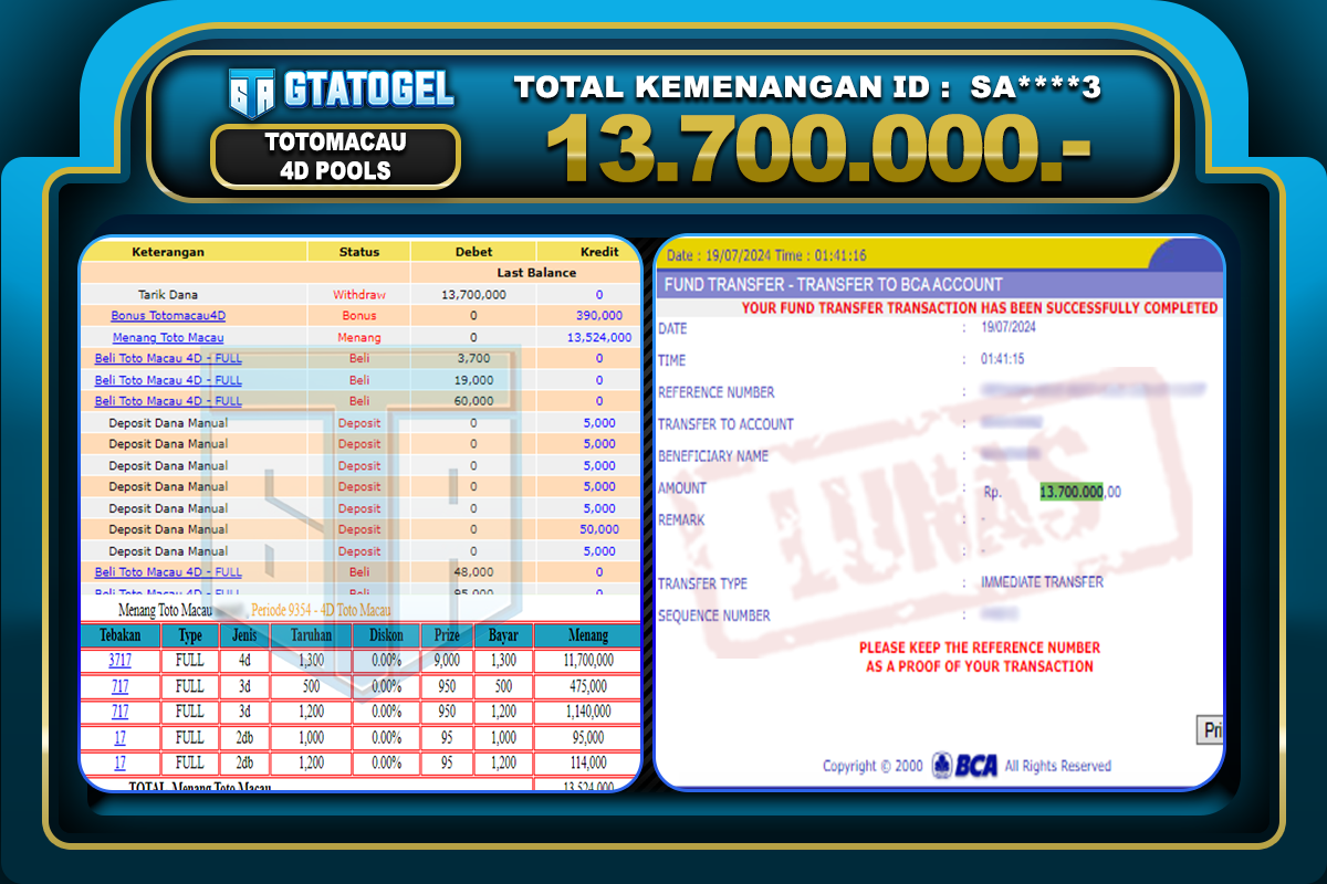 GTATOGEL – BUKTI WITHDRAW KEMENANGAN JP TOTOMACAU 4D POOLS Rp. 13.700.000,- DI BAYAR LUNAS !!!