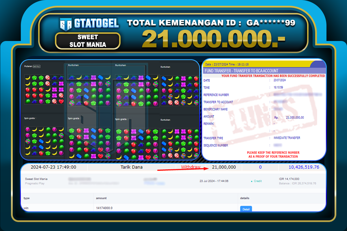 GTATOGEL – BUKTI WITHDRAW KEMENANGAN JP SWEET SLOT MANIA SEBESAR Rp. 21.000.000,- DI BAYAR LUNAS !!!