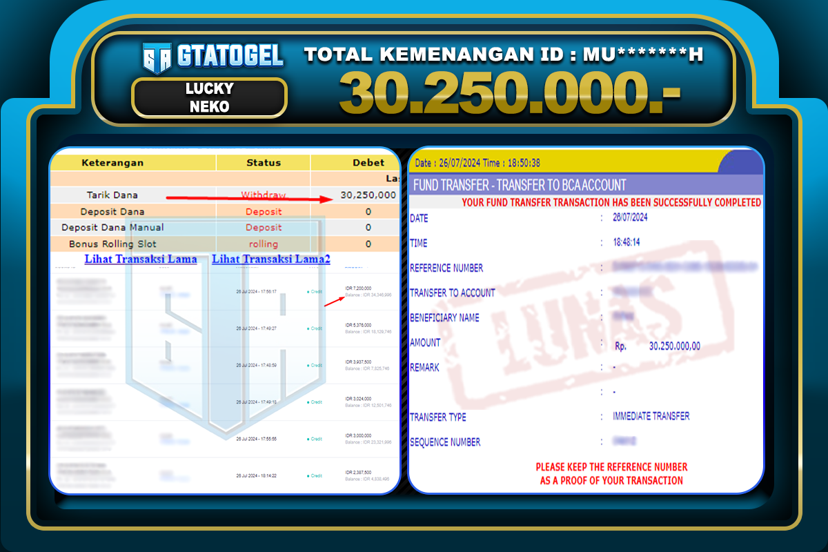GTATOGEL – BUKTI WITHDRAW KEMENANGAN JP TOGEL LUCKY NEKO SEBESAR Rp. 30.250.000,- DI BAYAR LUNAS !!!
