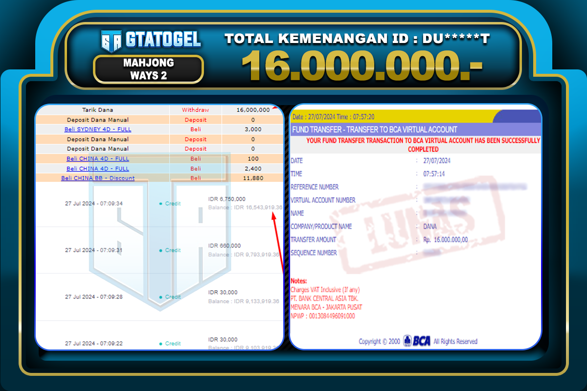GTATOGEL – BUKTI WITHDRAW KEMENANGAN JP MAHAJONG WAYS 2 Rp. 16.000.000,- DI BAYAR LUNAS !!!