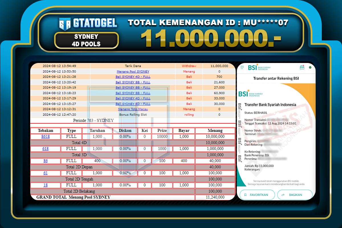 GTATOGEL – BUKTI WITHDRAW KEMENANGAN JP SYDNEY 4D POOLS Rp. 11.00.000,- DI BAYAR LUNAS !!!