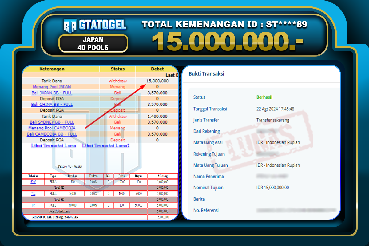 GTATOGEL – BUKTI WITHDRAW KEMENANGAN JP JAPAN 4D POOLS Rp. 15.000.000,- DI BAYAR LUNAS !!!