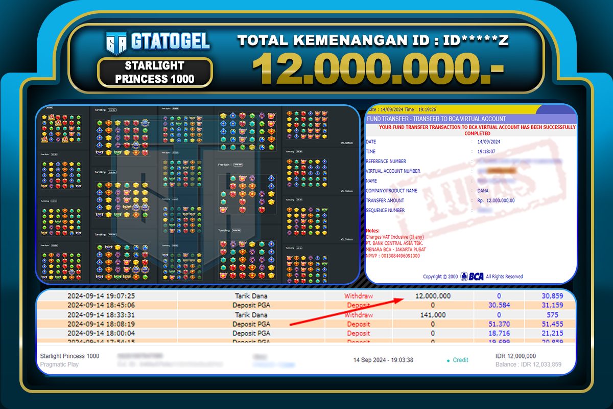 GTATOGEL – BUKTI WITHDRAW KEMENANGAN JP STARLIGHT PRINCESS 1000 Rp.12.000.000,- DI BAYAR LUNAS !!!