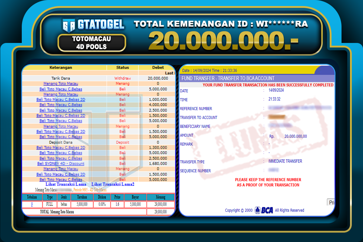 GTATOGEL – BUKTI WITHDRAW KEMENANGAN JP TOTOMACAU 4D POOLS Rp.20.000.000,- DI BAYAR LUNAS !!!