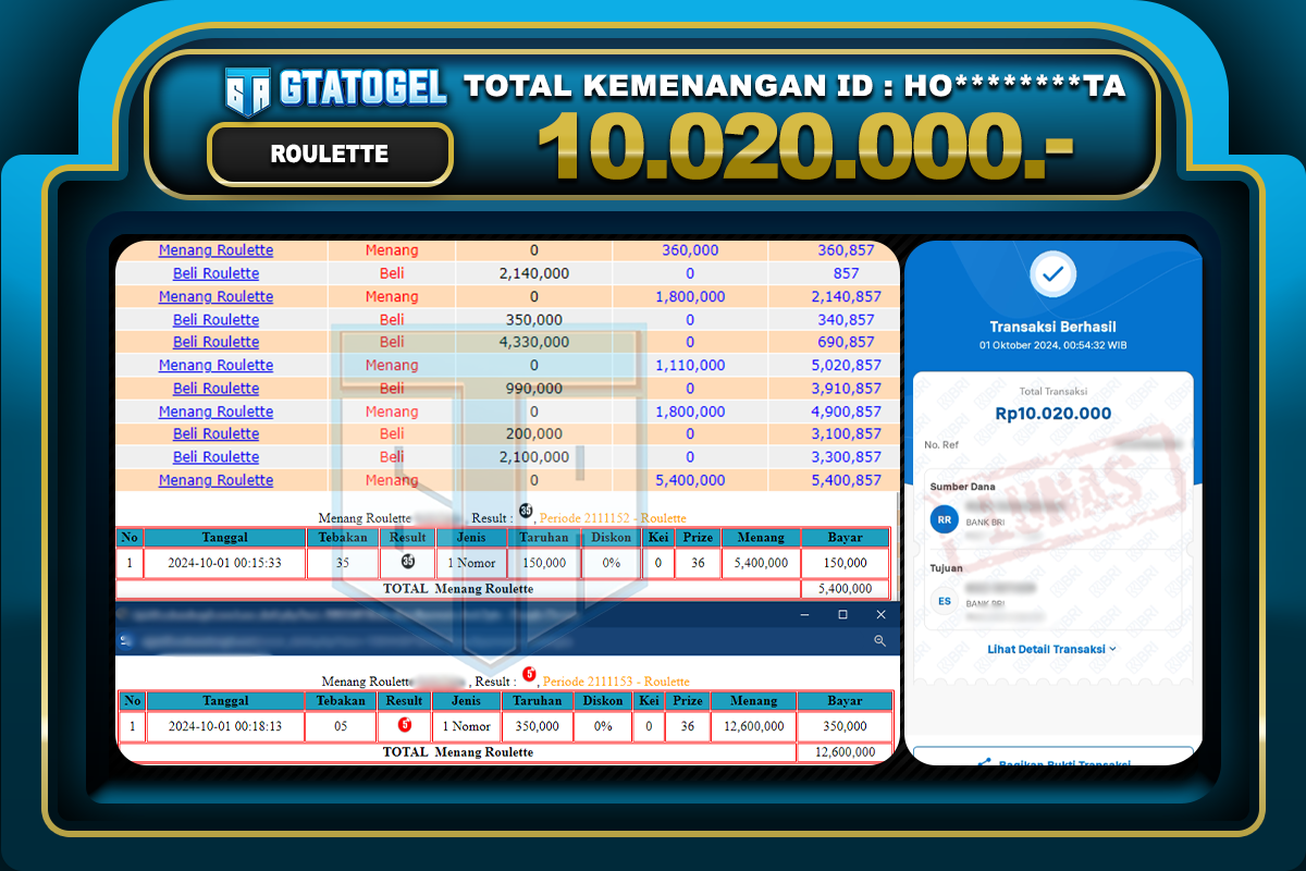 GTATOGEL – BUKTI WITHDRAW KEMENANGAN JP ROULETTERp.10.020.000,- DI BAYAR LUNAS !!!