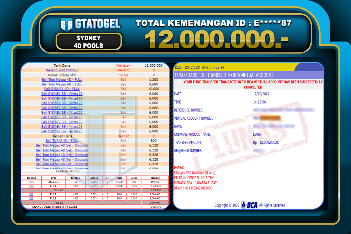 GTATOGEL – BUKTI WITHDRAW KEMENANGAN JP SYDNEY 4D POOLS Rp.12.000.000,- DI BAYAR LUNAS !!!