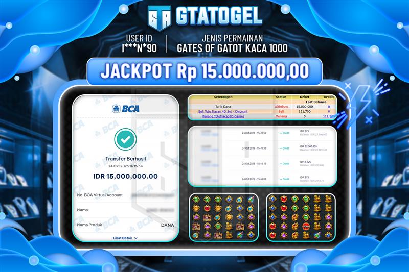 GTATOGEL – BUKTI WITHDRAW KEMENANGAN JACKPOT GATES OF GATOT KACA 1000 Rp.15.000.000,- DI BAYAR LUNAS !!!