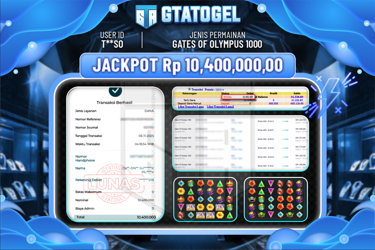 GTATOGEL – BUKTI WITHDRAW KEMENANGAN JACKPOT GATES OF OLYMPUS 1000 Rp.10.400.000,- DI BAYAR LUNAS !!!