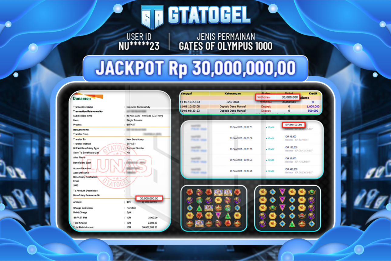 GTATOGEL – BUKTI WITHDRAW KEMENANGAN JACKPOT GATES OF OLYMPUS 1000 Rp.30.000.000,- DI BAYAR LUNAS !!!