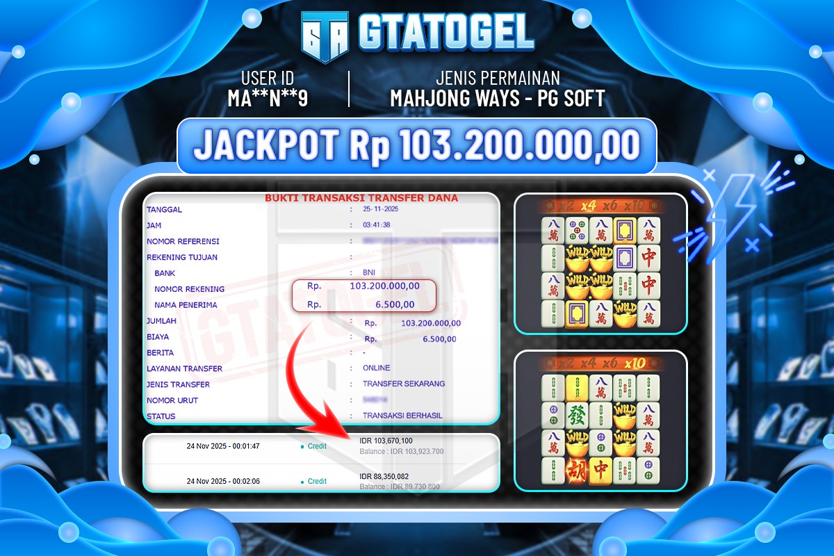 GTATOGEL – BUKTI WITHDRAW KEMENANGAN JACKPOT MAHJONG WAYS – PG SOFT Rp.103.200.000,- DI BAYAR LUNAS !!!