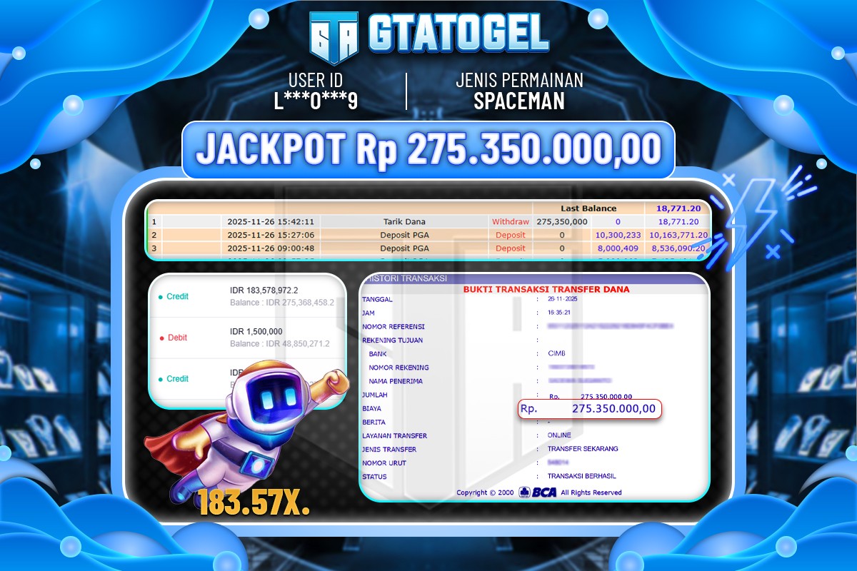 GTATOGEL – BUKTI WITHDRAW KEMENANGAN JACKPOT SPACEMAN Rp.275.350.000,- DI BAYAR LUNAS !!!