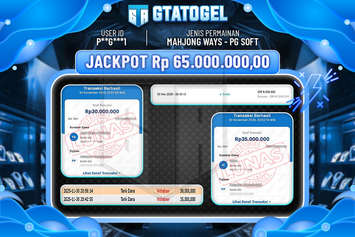 GTATOGEL – BUKTI WITHDRAW KEMENANGAN JACKPOT MAHJONG WAYS – PG SOFT Rp.65.000.000,- DI BAYAR LUNAS !!!
