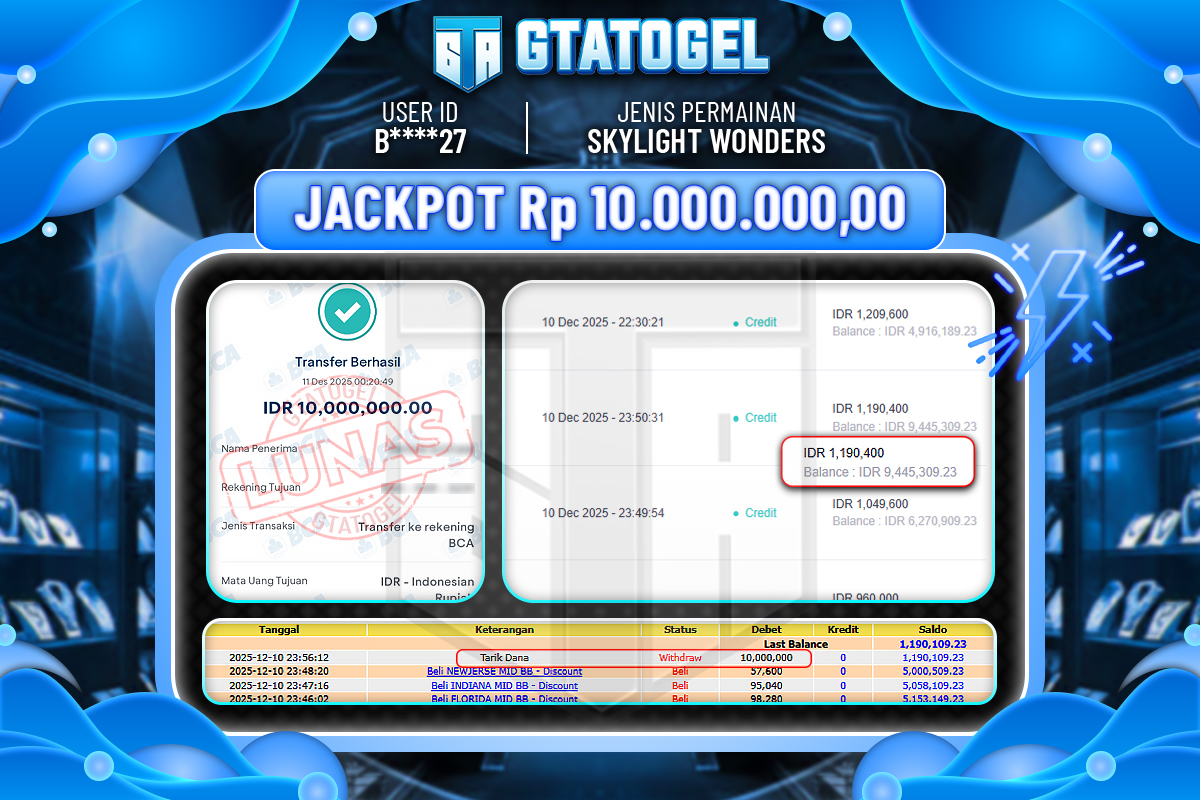 GTATOGEL – BUKTI WITHDRAW KEMENANGAN JACKPOT SKYLIGHT WONDERS Rp.10.000.000,- DI BAYAR LUNAS !!!