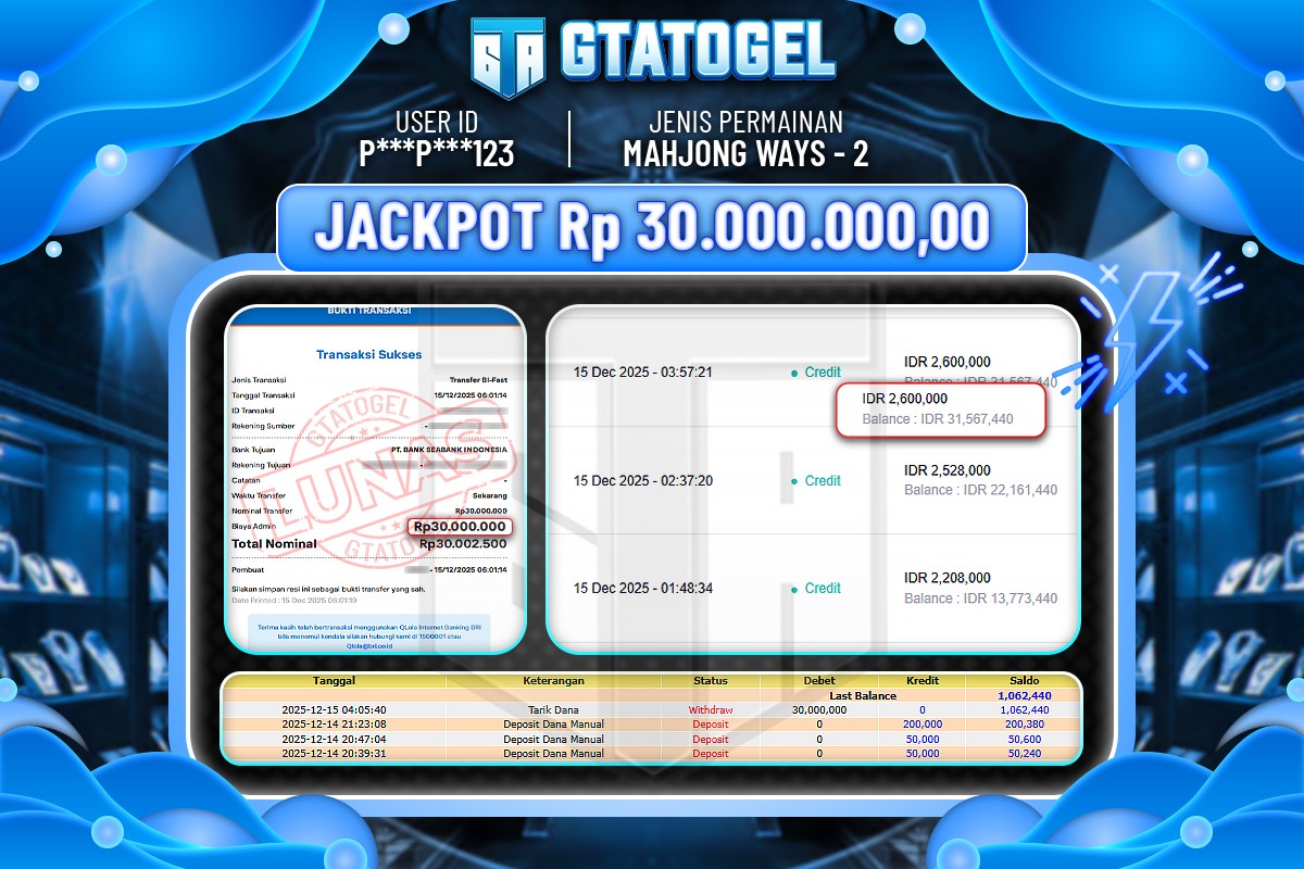 GTATOGEL – BUKTI WITHDRAW KEMENANGAN JACKPOT MAHJONG WAYS – 2 Rp.30.000.000,- DI BAYAR LUNAS !!!