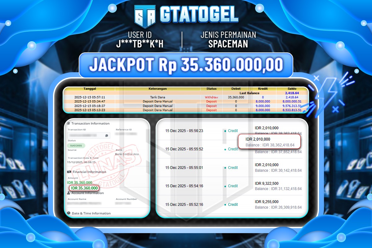 GTATOGEL – BUKTI WITHDRAW KEMENANGAN JACKPOT SPACEMAN Rp.35.360.000,- DI BAYAR LUNAS !!!
