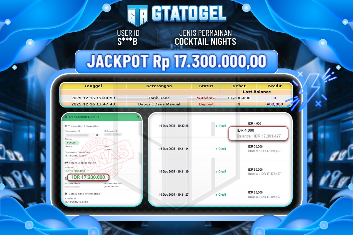 GTATOGEL – BUKTI WITHDRAW KEMENANGAN JACKPOT COCKTAIL NIGHT S Rp.17.300.000,- DI BAYAR LUNAS !!!