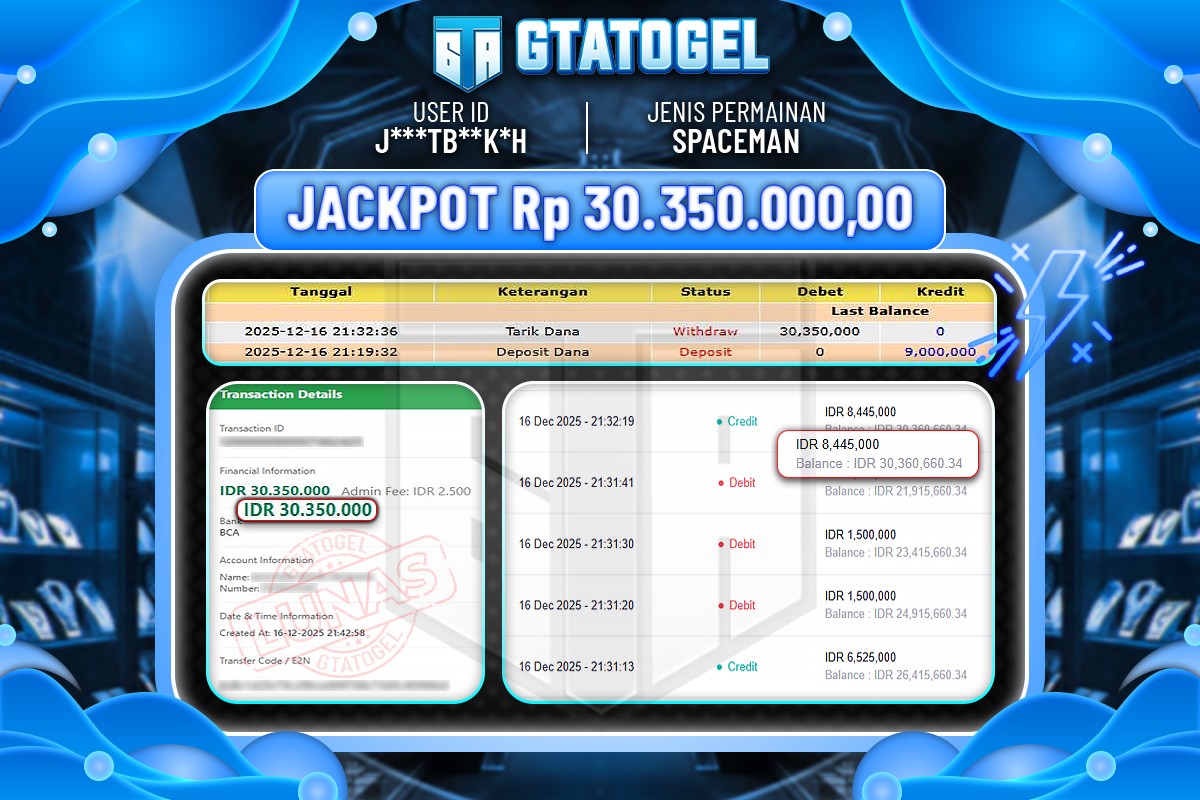 GTATOGEL – BUKTI WITHDRAW KEMENANGAN JACKPOT SPACEMAN Rp.30.350.000,- DI BAYAR LUNAS !!!