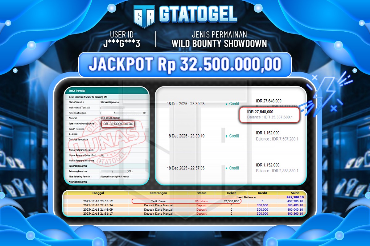 GTATOGEL – BUKTI WITHDRAW KEMENANGAN JACKPOT WILD BOUNTY SHOWDOWN Rp.32.500.000,- DI BAYAR LUNAS !!!