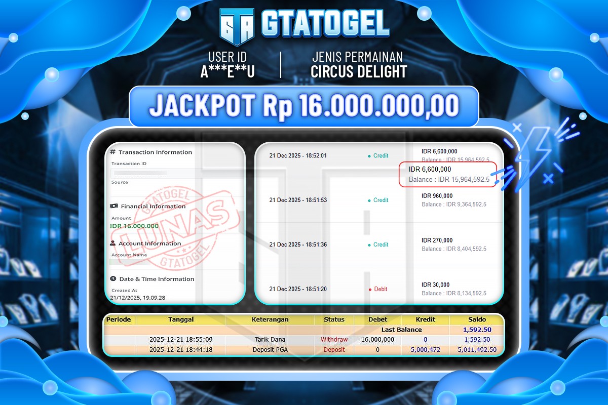 GTATOGEL – BUKTI WITHDRAW KEMENANGAN JACKPOT CIRCUS DELIGHT Rp.16.000.000,- DI BAYAR LUNAS !!!