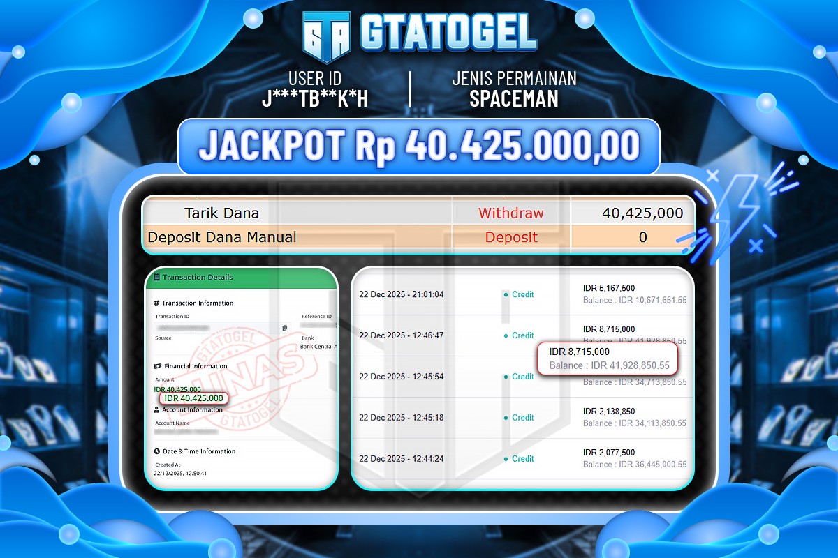 GTATOGEL – BUKTI WITHDRAW KEMENANGAN JACKPOT SPACEMAN Rp.40.425.000,- DI BAYAR LUNAS !!!