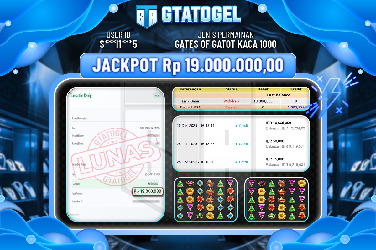 GTATOGEL – BUKTI WITHDRAW KEMENANGAN JACKPOT GATES OF GATOT KACA 1000 Rp.19.000.000,- DI BAYAR LUNAS !!!