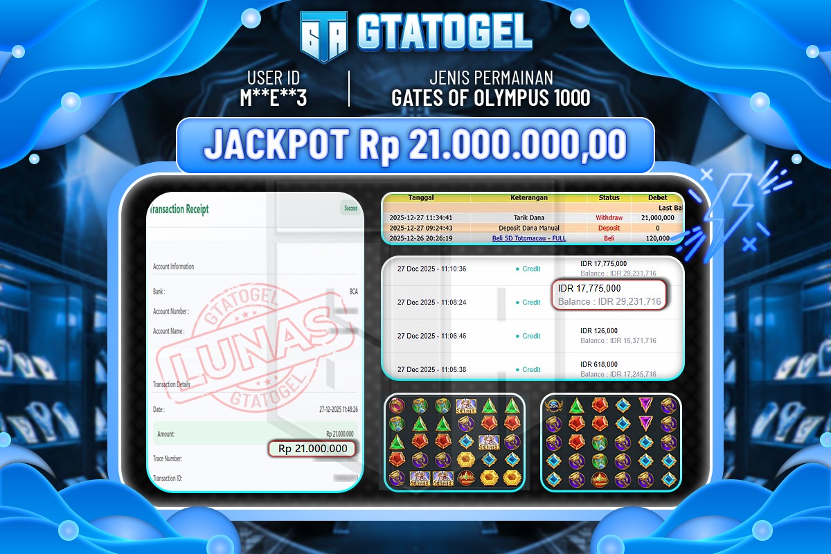 GTATOGEL – BUKTI WITHDRAW KEMENANGAN JACKPOT GATES OF OLYMPUS 1000 Rp.21.000.000,- DI BAYAR LUNAS !!!