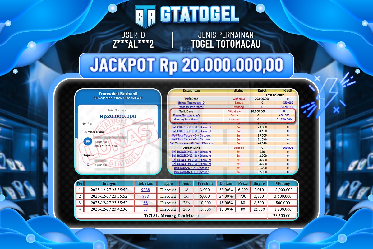 GTATOGEL – BUKTI WITHDRAW KEMENANGAN JACKPOT TOGEL TOTOMACAU Rp.20.000.000,- DI BAYAR LUNAS !!!