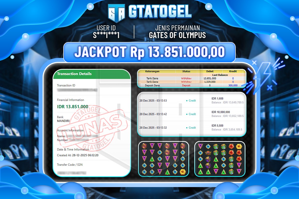 GTATOGEL – BUKTI WITHDRAW KEMENANGAN JACKPOT GATES OF OLYMPUS Rp.13.851.000,- DI BAYAR LUNAS !!!