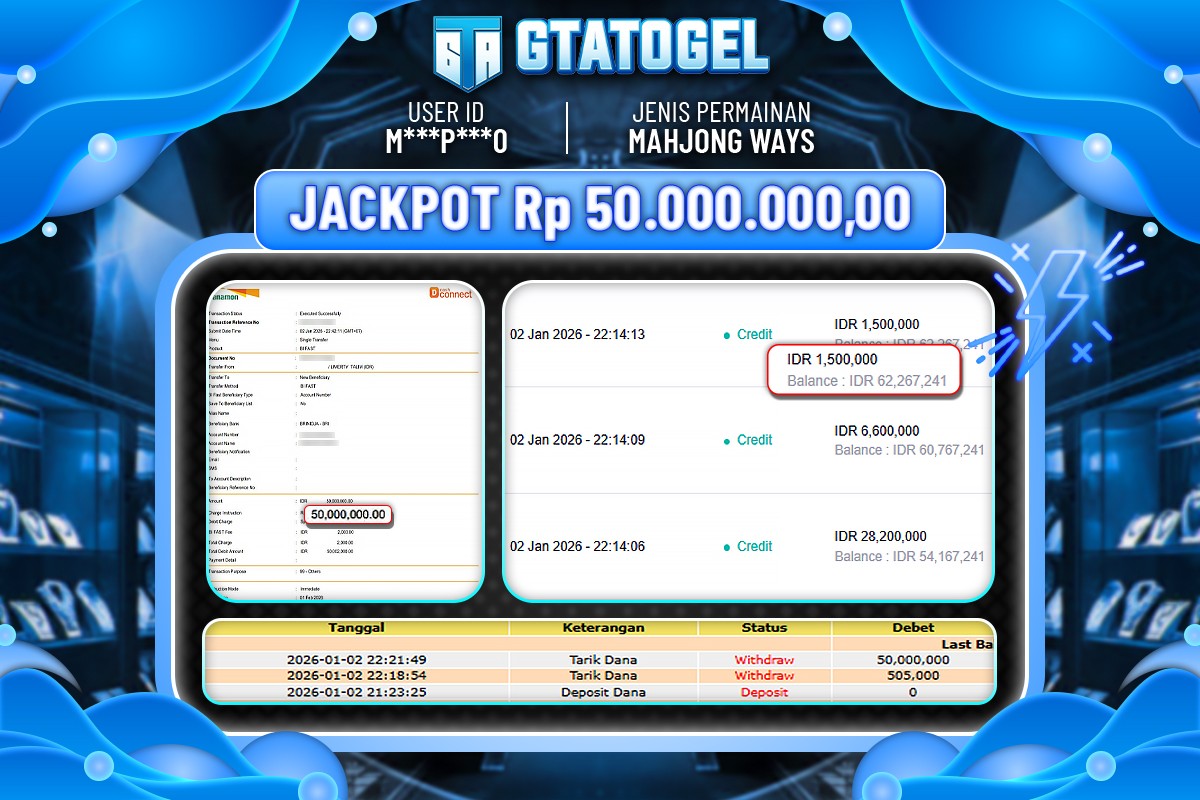 GTATOGEL – BUKTI WITHDRAW KEMENANGAN JACKPOT MAHJONG WAYS Rp.50.000.000,- DI BAYAR LUNAS !!!